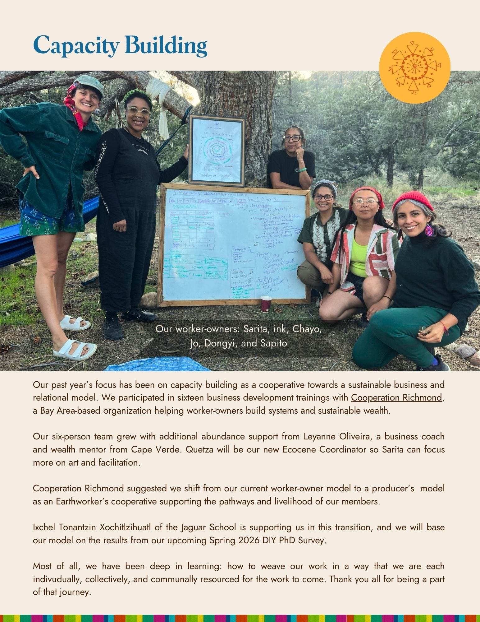 We have been boot-strapping, or surviving as a school thanks to some generous community donations and countless hours of sweat equity from our worker-owners. This past year offered our co-op invaluable mentorship and understanding of whatâs not working with a turning toward emergent and sustainable form. Whatâs clear is that we thrive in reciprocity with our community and will continue fine-tuning our model until we reach a sustainable flow. Sapito and ink have been dormant this season, and Quetza is coming on as our new Ecocene Coordinator this Spring!
