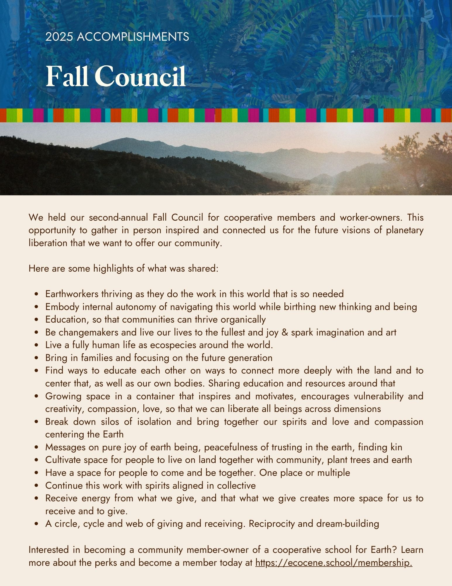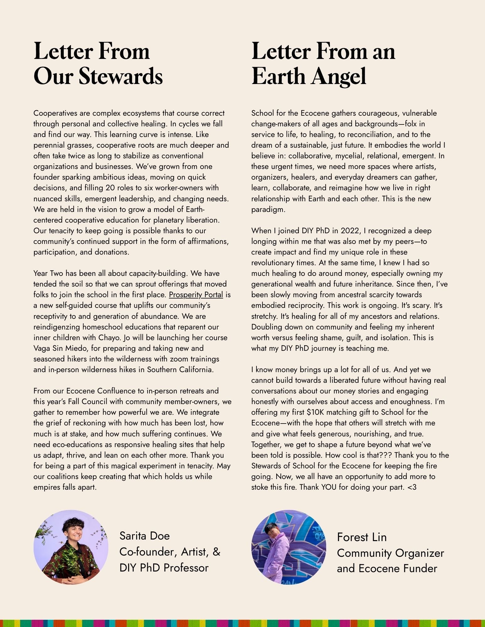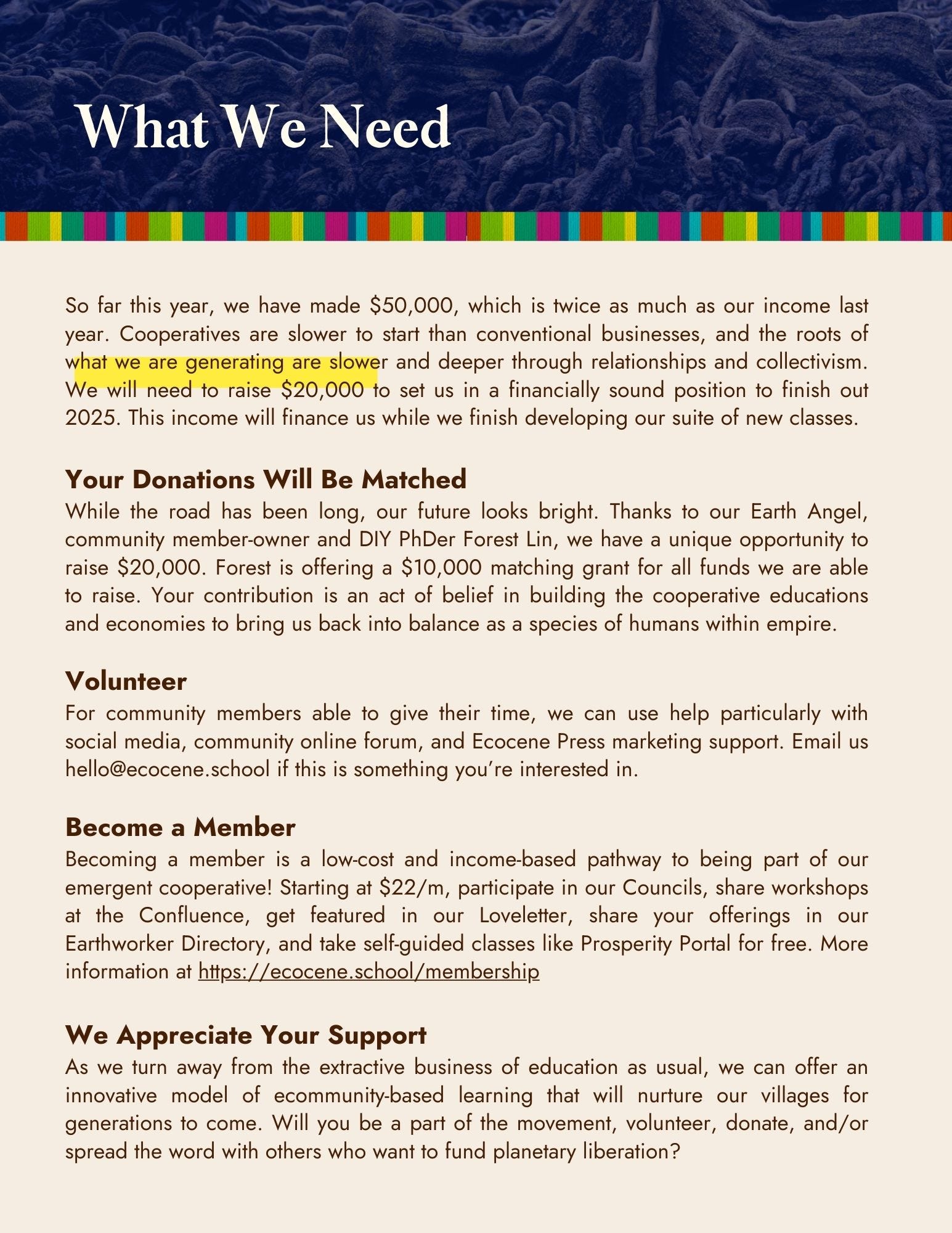 If youâre in a position to give before the end of the year, please consider contributing a tax-deductible gift to our Zeffy! Weâve received a generous donation from Earth Angel Forest, and give many thanks to them and our Ecocene members for sustaining our fledging and emergent cooperative. Every donation makes a big impact on us continuing to nurture education for planetary liberation! Thank you for being here.