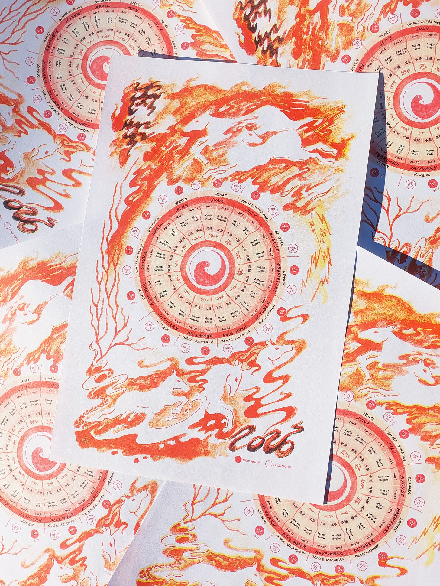 In 2026 we're welcoming in a very firey, yang Year of the Horse. The year begins on February 17th, 2026 (Lunar New Year) and ends after the full moon on January 22nd, 2027. The calendar deepens into the relationships between moon cycles, corresponding organs according to Traditional Chinese Medicine, the 12 zodiac animals, and the 24 solar terms of the Chinese lunisolar, an agrarian time keeping system in which farmers kept track of planting and harvest times as well as celebrations.